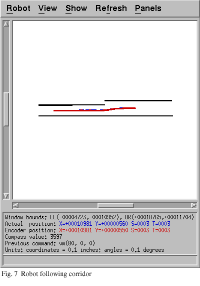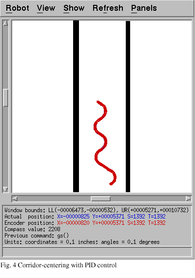 After fixing this during week two, the robot stopped running into corners. We then added support for the long-range sonar sensors. The input from the sonar sensors is used to assist the robot in staying in the middle of hallways (or in the most open space available). We experimented with PID control using the position-relative commands available for the robot rather than the velocity commands. During this stage, the robot (as shown in Fig. 4) continuously oscillated side to side down the hallway. It later became evident that this problem was likely due to the implementation of the position-relative commands. Rather than directing the robot to turn 5 degrees to the left, each time the command was sent the robot would attempt to turn 5 more degrees to the left from its current position. We later abandoned this approach for a method based on setting the robot's rotation velocity.