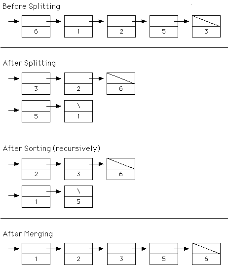 Below we show the mergesort process. The original list is split into two lists of roughly equal length. This can be done most easily by modifying the references in the original list, scanning it from front to back and building the split lists back to front. After splitting, the two lists are sorted by recursive calls to mergesort. Then the two resulting lists are merged. Merging consists of traversing the two sorted lists from front to back and "building" a new list from front to back at the same time.