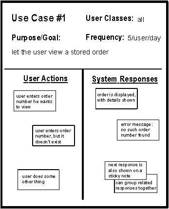 After each workshop, I took the flipcharts festooned with sticky notes to my office and began to extract requirements from each use case. Most of these requirements represented those software functions that would be needed to allow a user to execute each use case. I began documenting the requirements and business rules in a structured software requirements specification, or SRS, which grew from week to week.